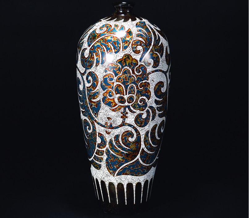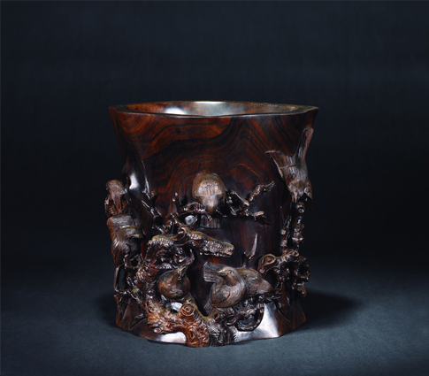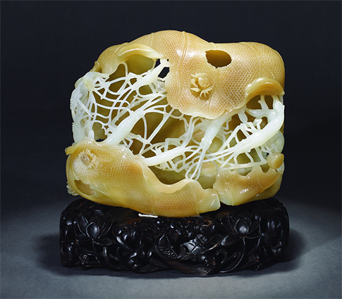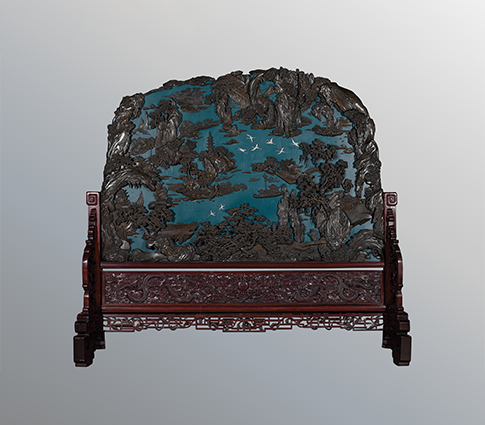 “龍鳳呈祥”選用檀香木和紫檀木精雕而成。外圍支撐選用檀香木,中部花球和外圍花紋形成的環(huán)形部分由紫檀所雕而成。花球完全透雕,可自由轉(zhuǎn)動(dòng)。周身采用拉花工藝,精致細(xì)膩,遠(yuǎn)看極具金屬質(zhì)感。整件作品造型優(yōu)美,洋溢著古典的神韻。