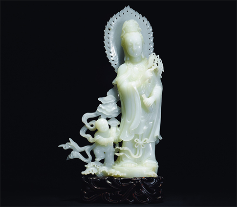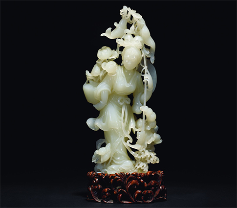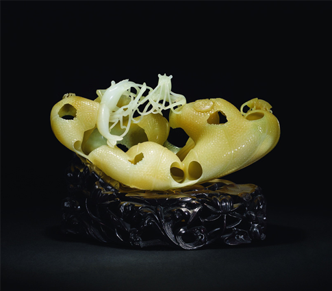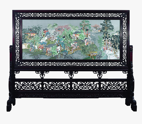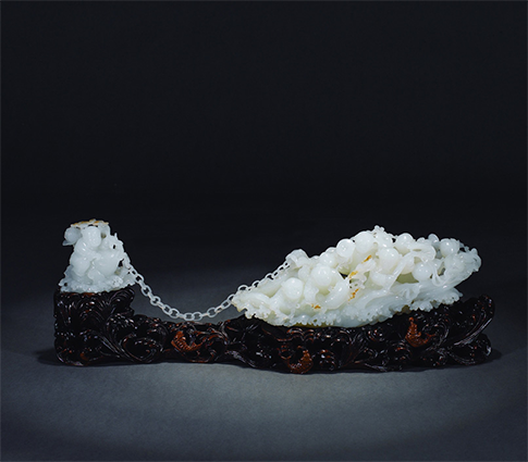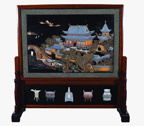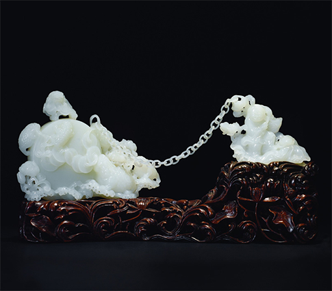 “花好月圓”的整體造型為一座雕滿(mǎn)靈芝的紫檀木托起一把宮扇,宮扇由檀香木、紫檀和翡翠雕刻而成。扇中心是一個(gè)轉(zhuǎn)動(dòng)自如的鏤空花球,球體上刻有牡丹、梅花和蓮花,分別代表祖國(guó)、江蘇和澳門(mén)。扇柄中央雕刻牡丹和梅花,扇柄下端利用翡翠鏈條串聯(lián)起兩個(gè)檀香木雕花球和一塊磬形云板。構(gòu)思精巧、線(xiàn)條流暢,蘊(yùn)含花好月圓、興旺祥和的祝愿。